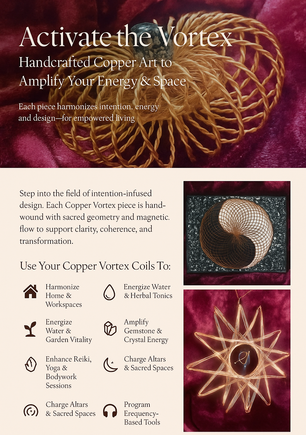 Empower your living field. Each Copper Vortex creation harmonizes intention, energy, and sacred design to awaken higher resonance in your life.