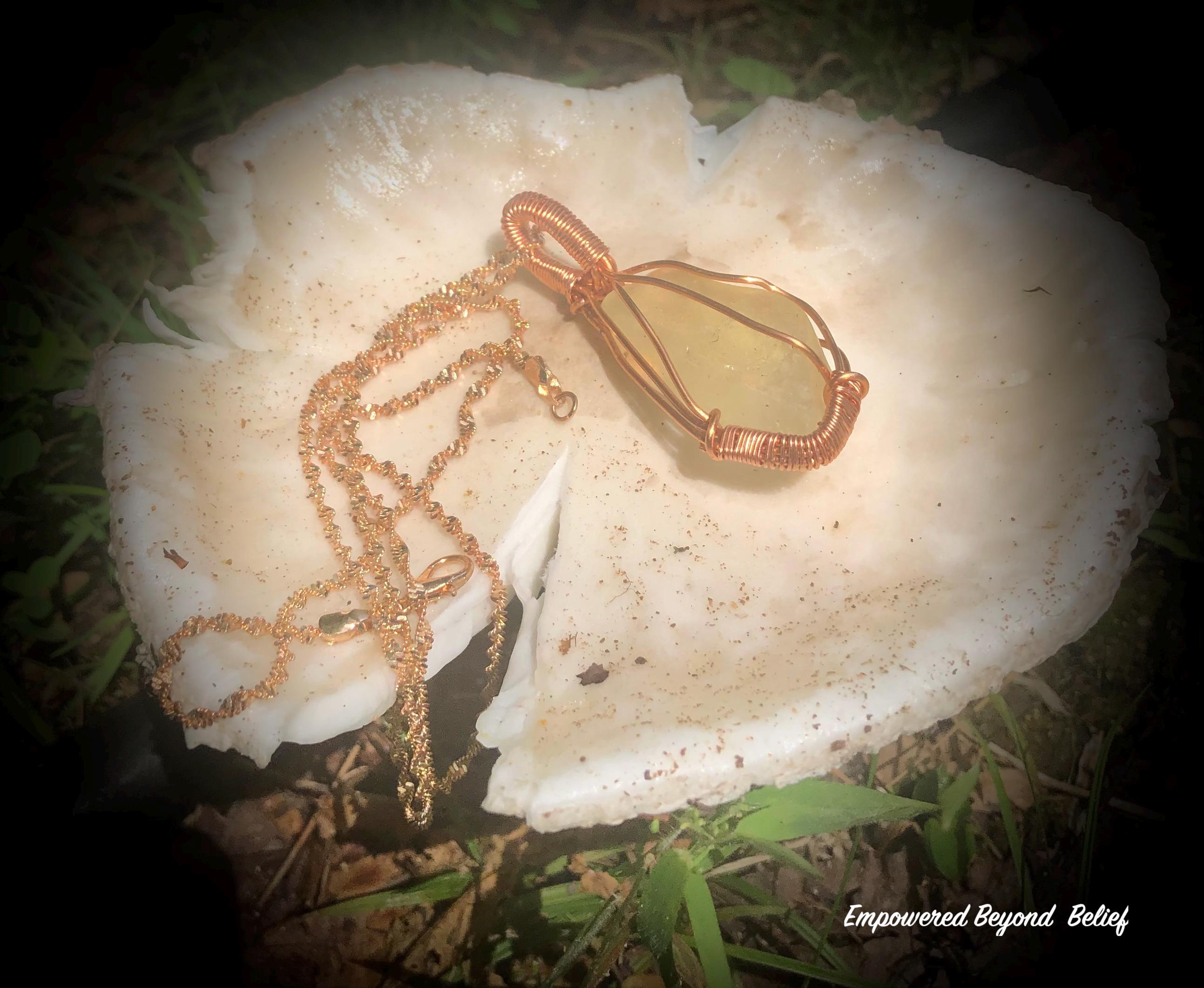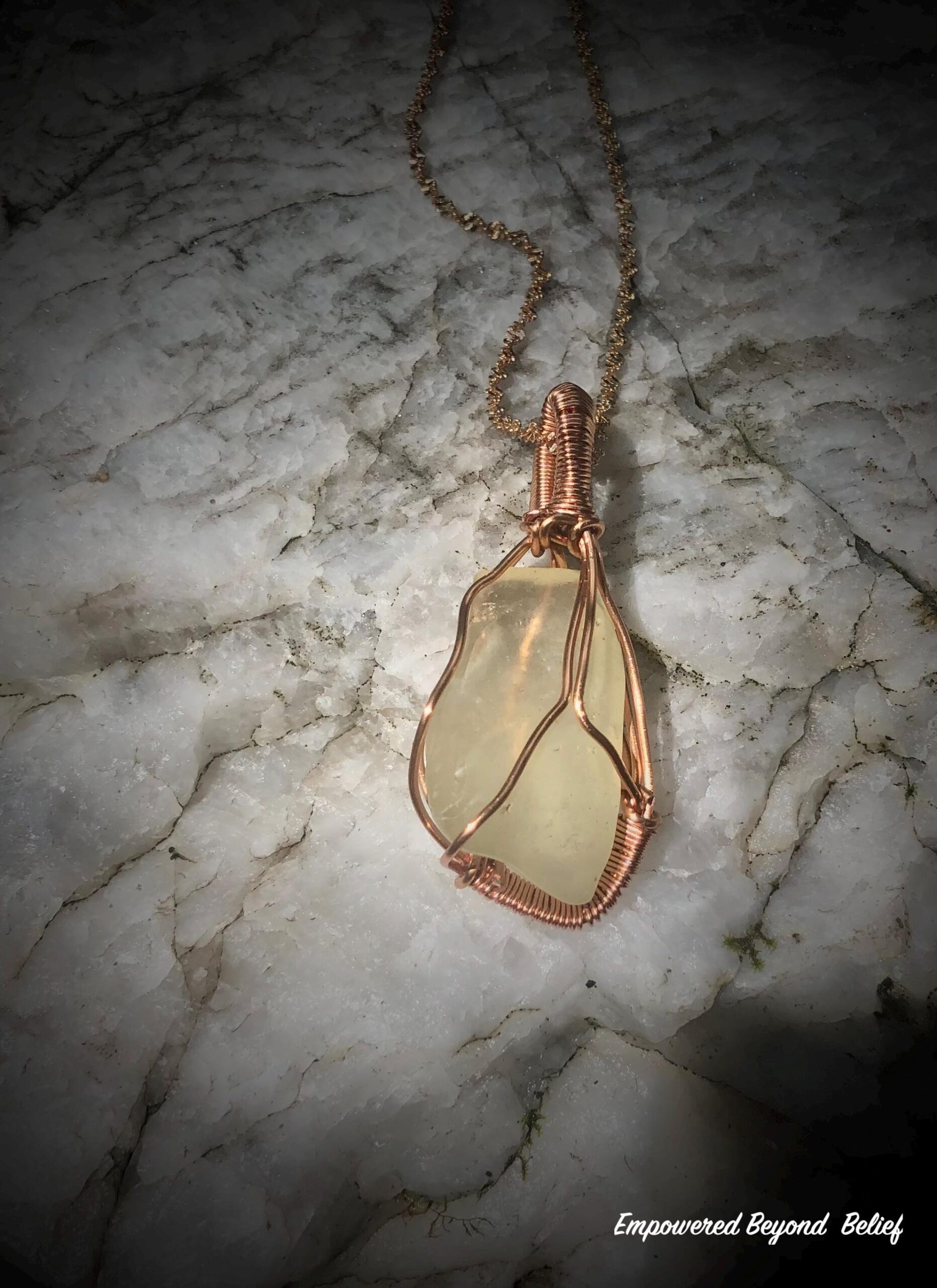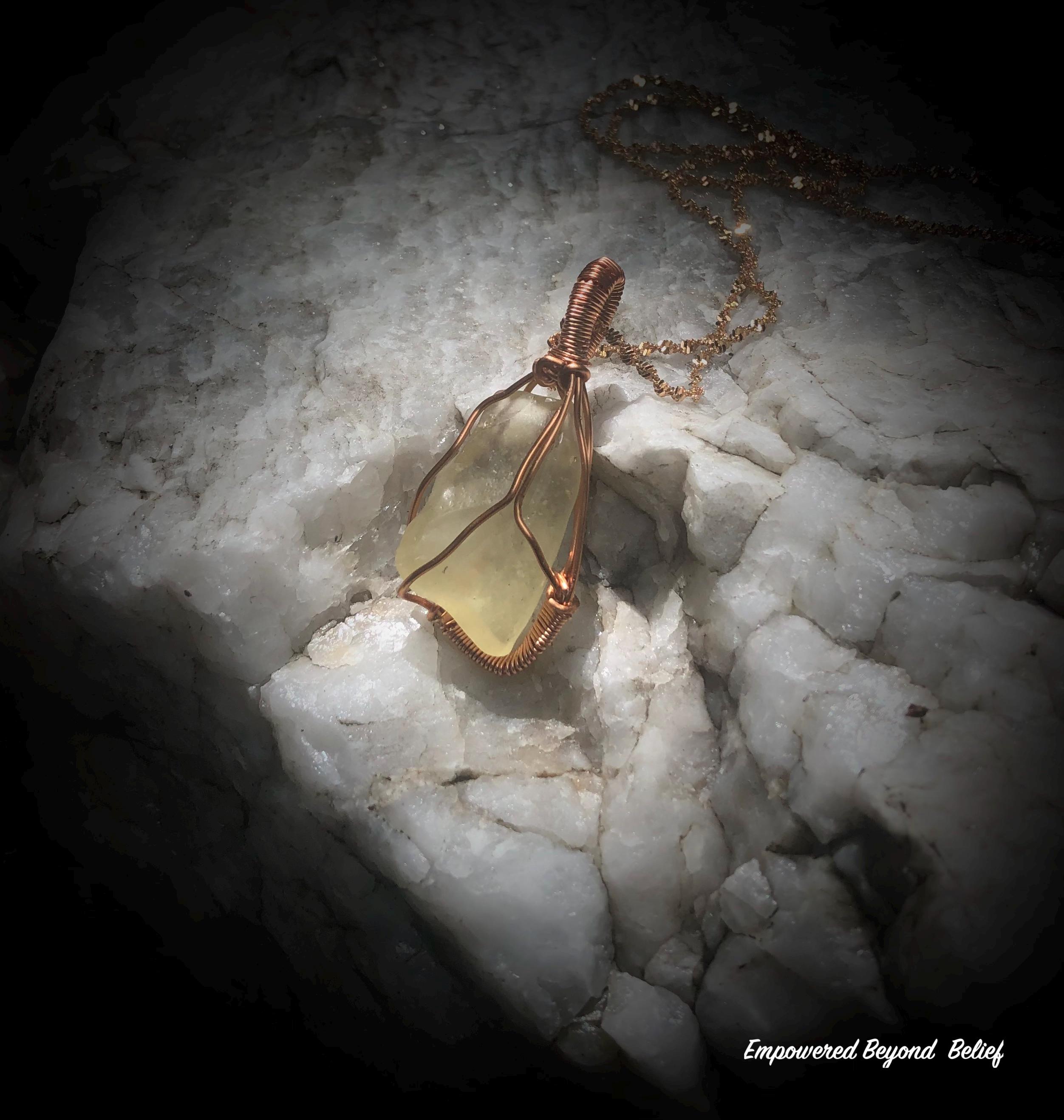 Experience ancient power and celestial transformation with this handmade Libyan Desert Glass pendant. Crafted with care, it features a natural, uncut specimen wrapped in woven copper wire. Remarkably, this captivating yellow-gold stone is believed to have formed from a meteorite impact in the Sahara Desert over 29 million years ago. As a result, it stands among the oldest known impact materials on Earth.
