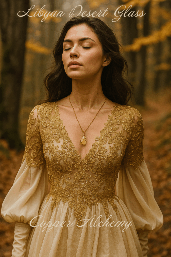 Desert Glass pendant. Crafted with care, it features a natural, uncut specimen wrapped in woven copper wire. Remarkably, this captivating yellow-gold stone is believed to have formed from a meteorite impact in the Sahara Desert over 29 million years ago. As a result, it stands among the oldest known impact materials on Earth.